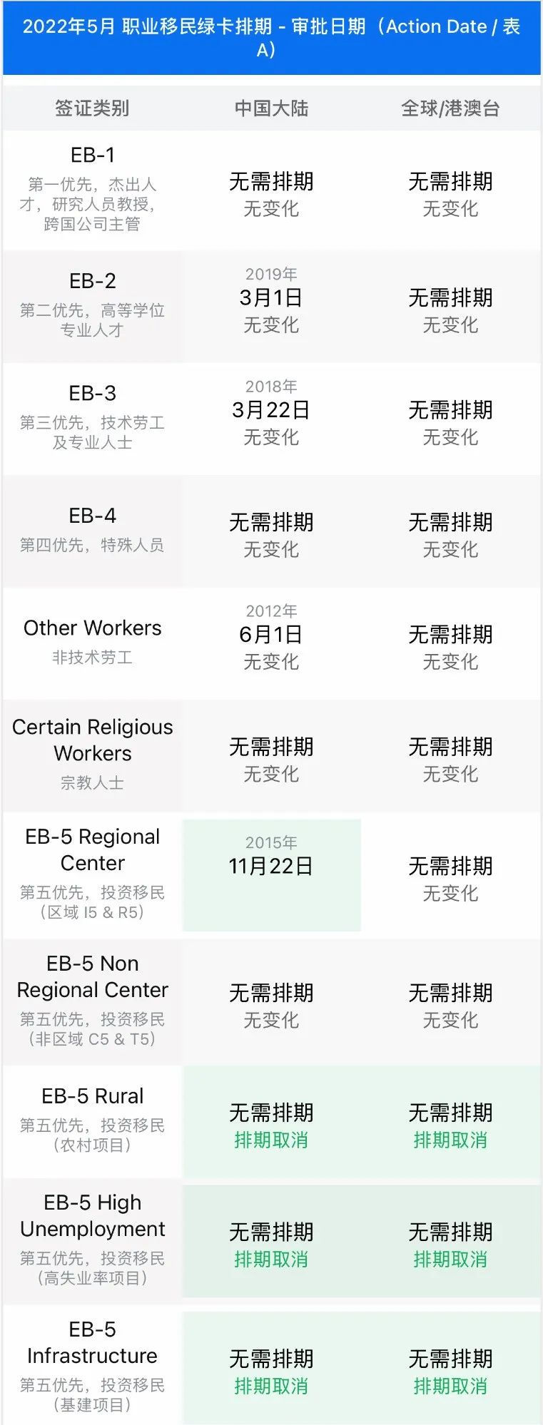 5月移民排期表。你的排期前进了吗 ?(EB-5类别更改)